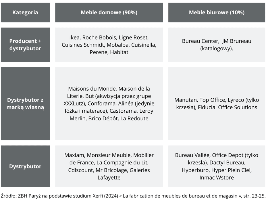 Główne firmy specjalizujące się przede wszystkim w sprzedaży klientom indywidualnym to: IKEA, But, Conforama, Alinea, Habitat, Maisons du Monde, Maxiam, Monsieur Meuble, Mobilier de France, Roche Bobois, Ligne Roset, Cuisines Schmidt, Mobalpa, Cuisinella, Perene, Maison de la Literie, La Compagnie du Lit. Konkurują z nimi markety wielobranżowego asortymentu budowlanego, sprzedające również wyposażenie meblowe, takie jak: Cdiscount, La Redoute, Castorama, Leroy Merlin, Brico Dépôt, Mr Bricolage, Galeries Lafayette.