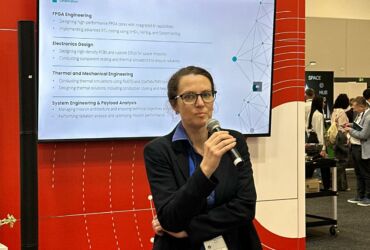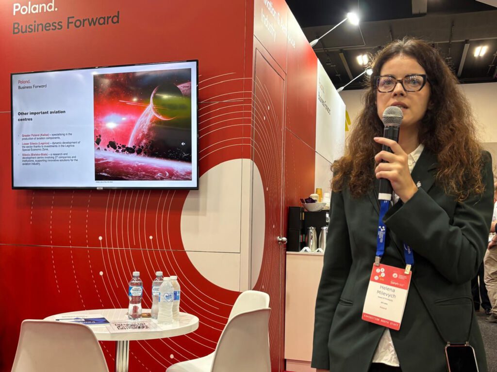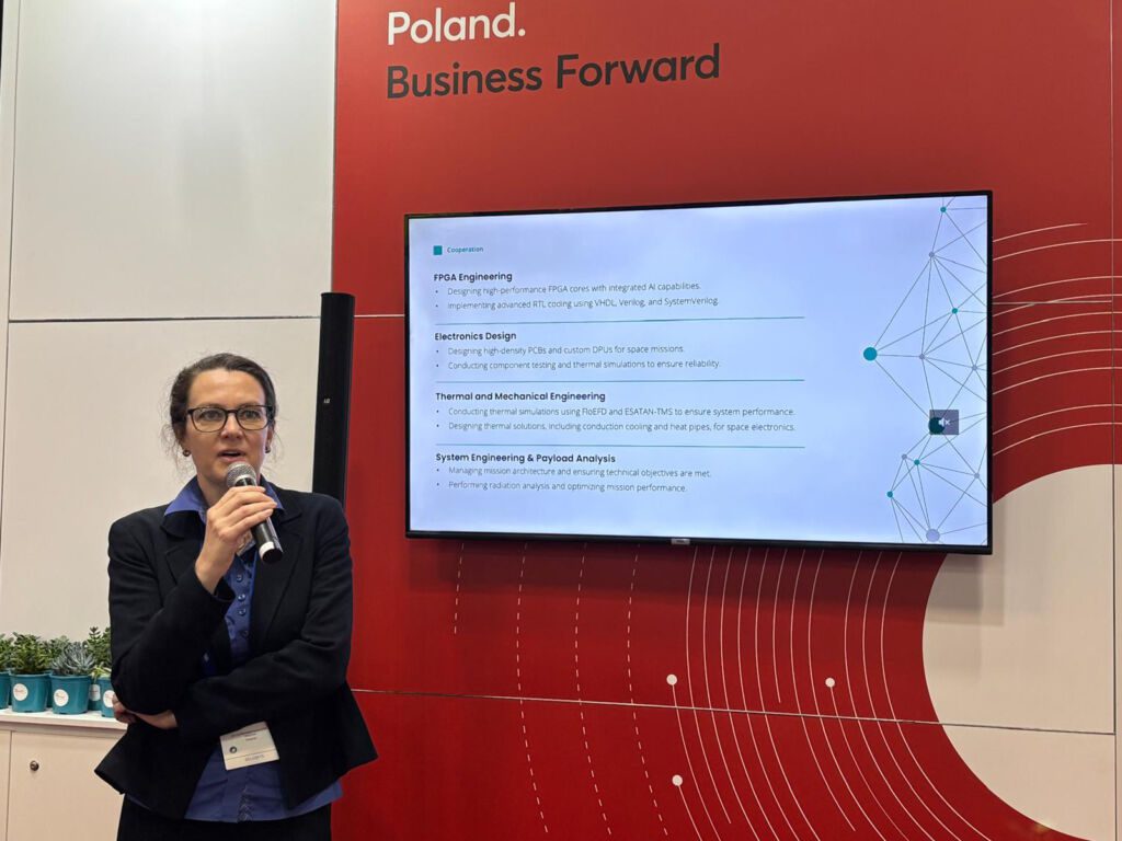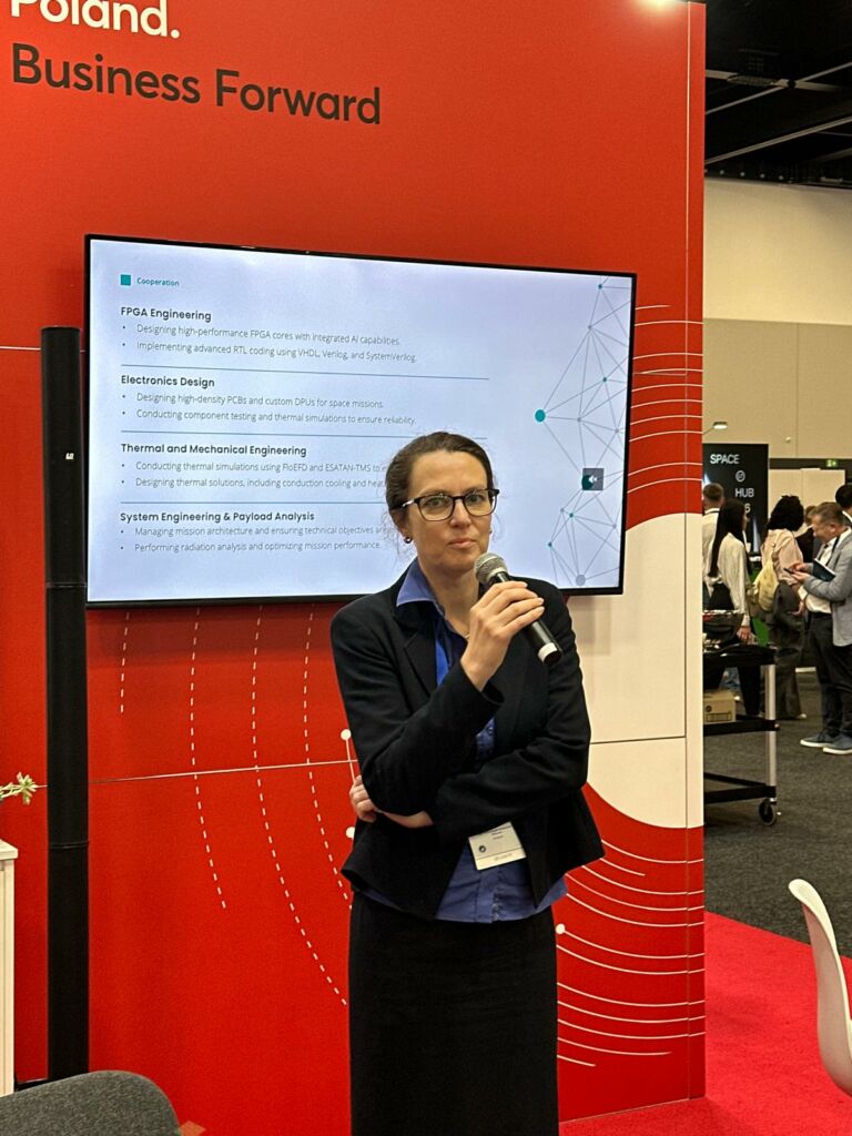 W ramach codziennej prezentacji sektora ekspertka Brand HUB Helena Milevych przedstawiła zebranym gościom osiągnięcia polskiej branży kosmicznej oraz produkty firm prezentujących się na stoisku POLSA.