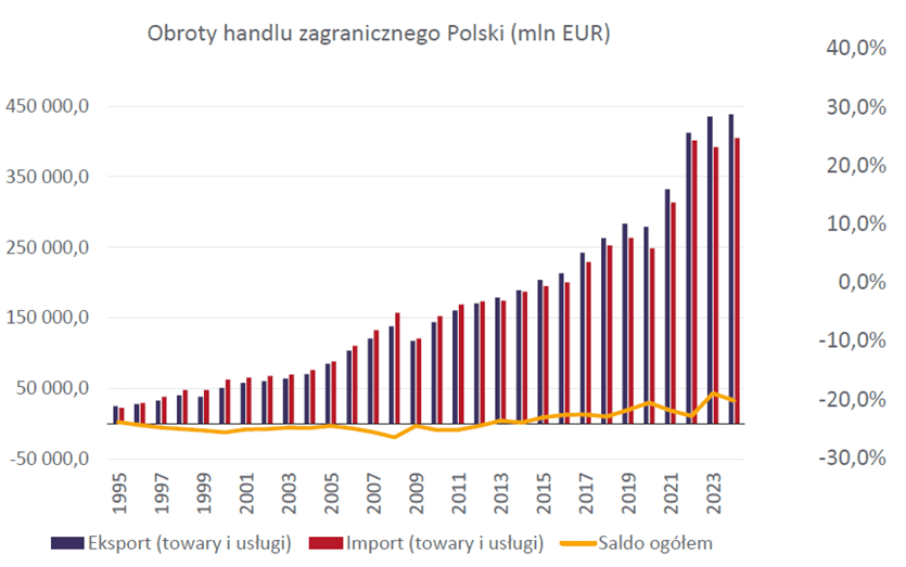 Internationalisation of the Polish economy is featured by dynamic progresses. Export of goods and services accounts currently for more than 50% of the Polish GDP and reached a record level of EUR 438 million in 2024, which is the highest value in the history of Poland. This means that the Polish entrepreneurs increasingly satisfy the demand of foreign consumers rather than Polish.