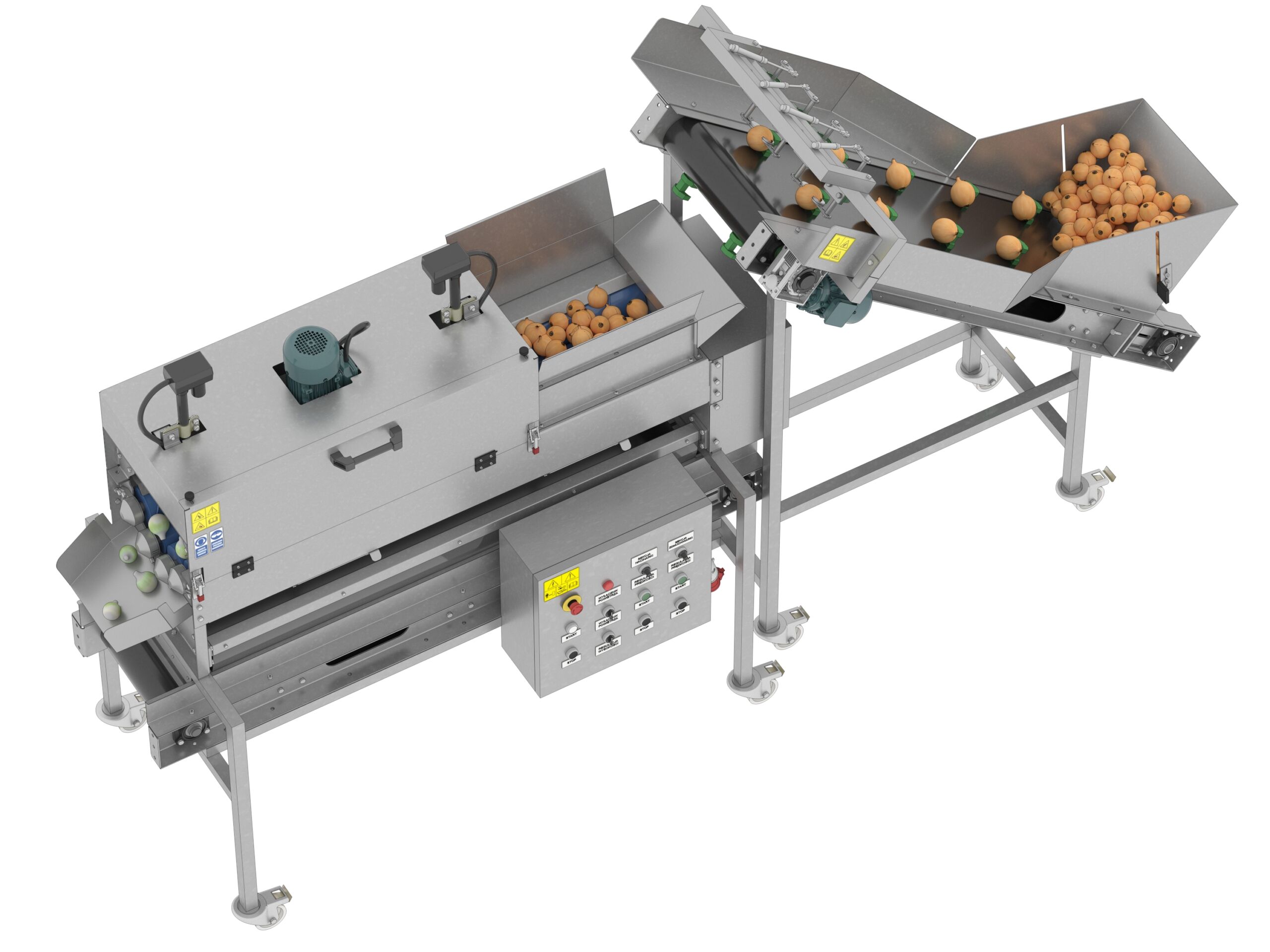 - Blowing, sorting, and buffering without manual intervention – capacity of 240 onions per minute
