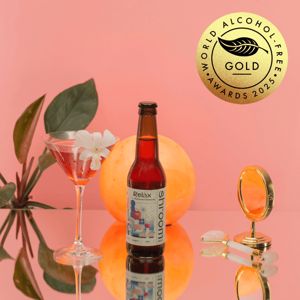 Shroom Relax is a soothing, functional drink with a rich aronia berry flavour. It contains natural L-theanine from green tea to support relaxation and mental clarity—without drowsiness. Lion's mane to support your mood and brain. No added sugar, contains prebiotic inuline. Gold Medal Winner at the Alcohol-Free Awards 2025, it's your perfect companion for unwinding, day or night.