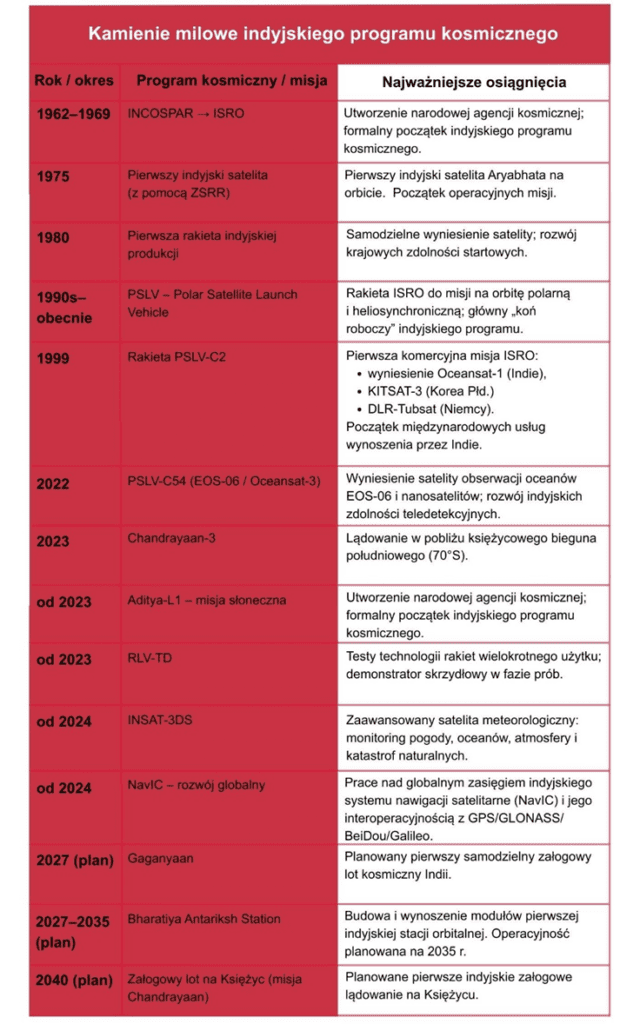 Indie umacniają swoją pozycję jako najważniejszy po USA, Chinach i Rosji gracz na globalnym rynku kosmicznym, mimo stosunkowo niewielkich nominalnych nakładów na badania i programy kosmiczne. W ostatnich latach obserwuje się coraz większe zaangażowanie indyjskiej agencji ISRO we współpracę z NASA i europejską ESA oraz aktywizację podmiotów prywatnych dzięki działalności agencji IN-SPACe. Ten tworzący się międzynarodowy ekosystem powoduje, że polskie firmy kosmiczne powinny rozważyć nawiązanie partnerstw z przedsiębiorstwami z subkontynentu, wykorzystując komplementarność sektorów w obu państwach.