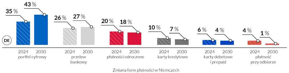 Prognozy pokazują, że Niemcy w perspektywie 5 kolejnych lat będą coraz bardziej korzystać z portfeli cyfrowych, których udział w całości płatności z 35 proc. w 2024 r. ma wzrosnąć do 43 proc. w 2030 r. Stabilnie trzymają się przelewy – lekkie odbicie z 26 proc. do 27 proc. w 2030 r.  Wszystkie pozostałe formy płatności będą zmniejszały swój udział: płatności odroczone (BNPL – buy now, pay later) spadną z 20 proc. do 18 proc., podobnie karty kredytowe (z 10 proc. do 7 proc.), oraz debetowe i prepaid (z 6 proc. do 4 proc.). Płatność przy odbiorze będą znikać z rynku (z 4 proc. do 1 proc.).